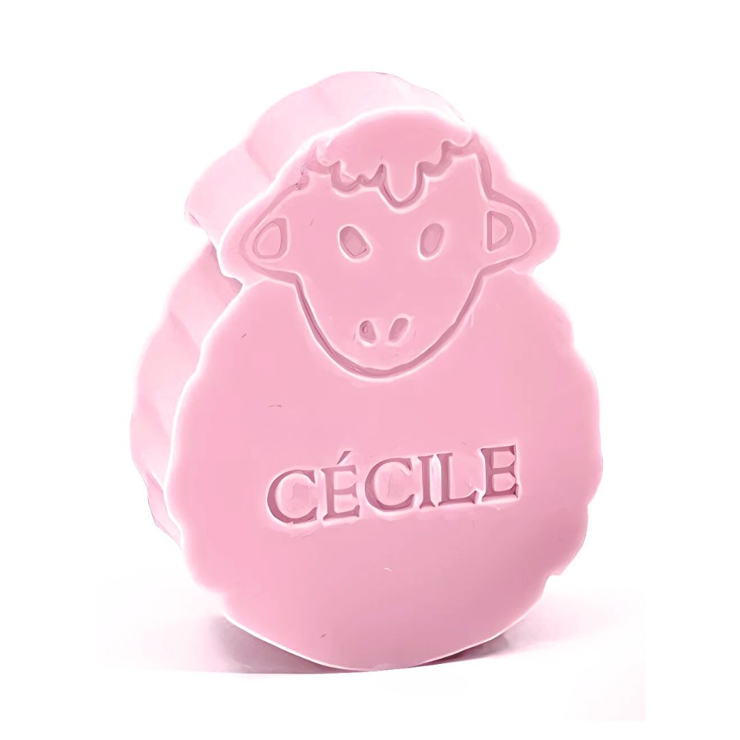 Dit schattige zeepje in de vorm van een schaapje kan gepersonaliseerd worden met een naam en is ideaal als geboortebedankje of voor een communie of lentefeest.